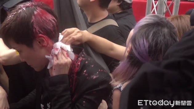 ▲何韻詩受訪時,遭右後方頭帶黑色面罩、黃色安全帽的不明人士潑漆 。(圖/記者范綱儀攝)