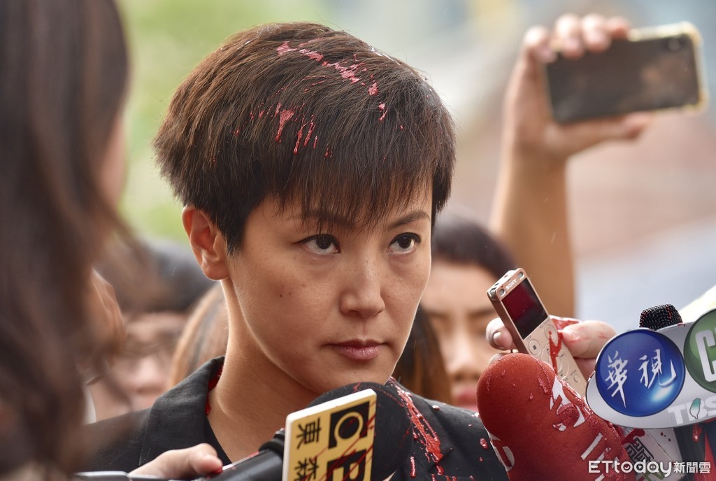 ▲何韻詩受訪時遭潑漆。(圖/記者李毓康攝)