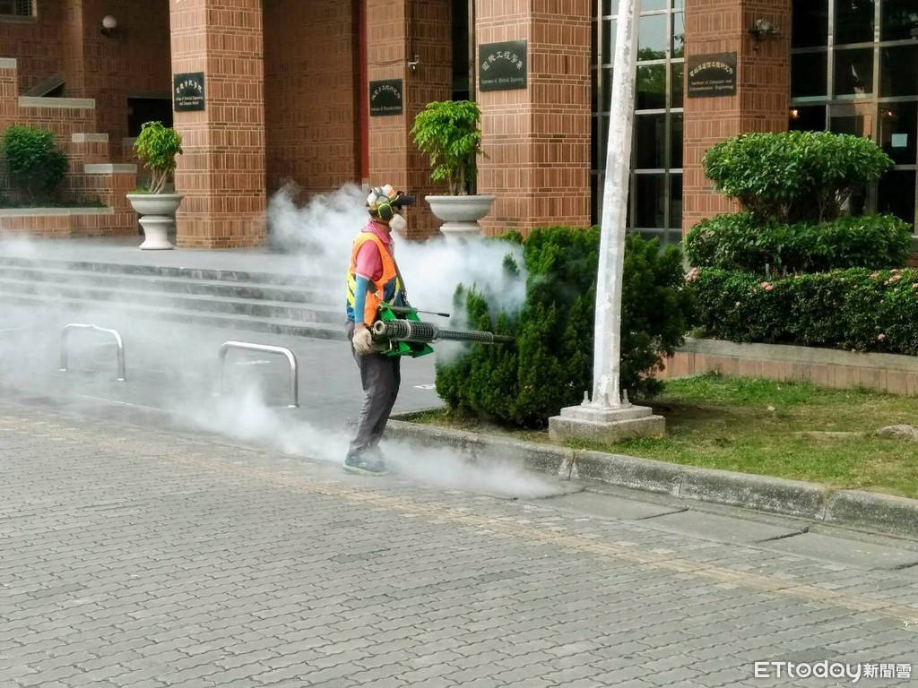 ▲台南市登革熱防治中心於成大校園進行的噴藥作業、加強擴大孳生源清除及插立警戒旗,防治作業持續進行,登革熱群聚疫情已掌控 請民眾勿恐慌。(圖/記者林悅翻攝,下同)