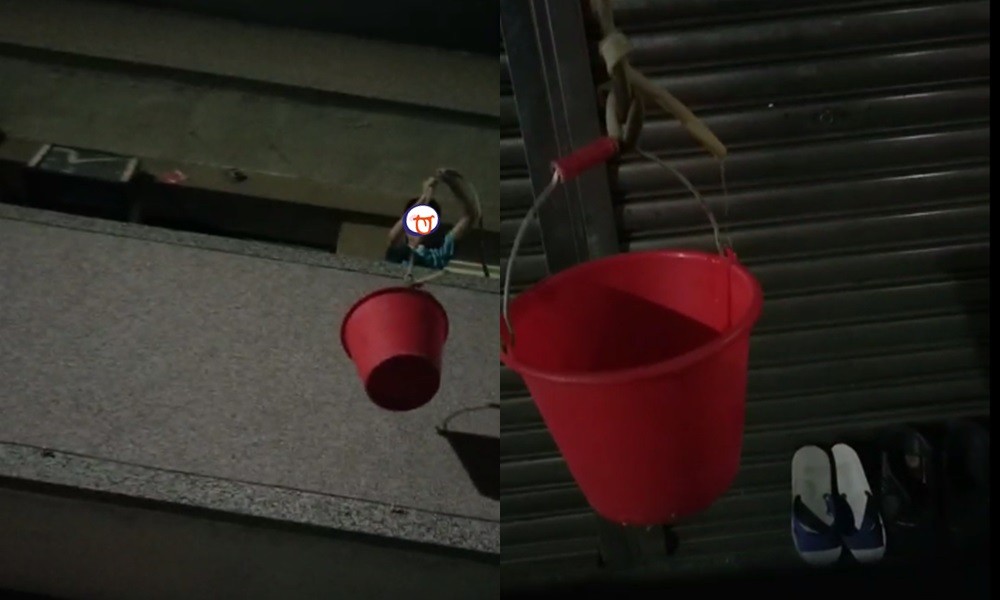 ▲機智弟怕吵阿公睡覺,從2樓吊水桶給外送員。(圖/翻攝自爆廢公社)