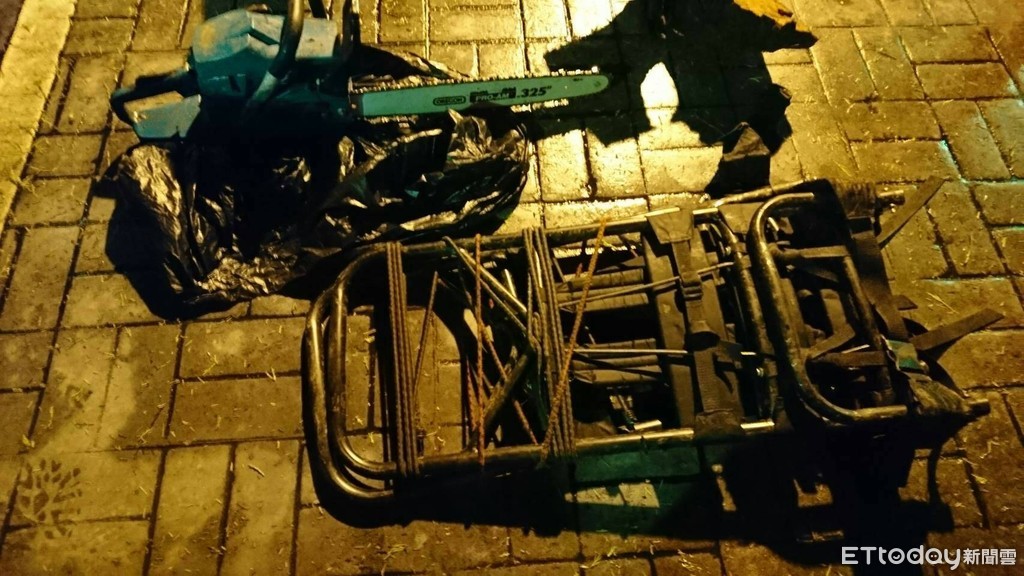 ▲桃園市大溪警分局今年5月間查獲劉姓男子竊取珍貴林木,起出做案用背架、鏈鋸等證物。(資料照/記者沈繼昌翻攝)