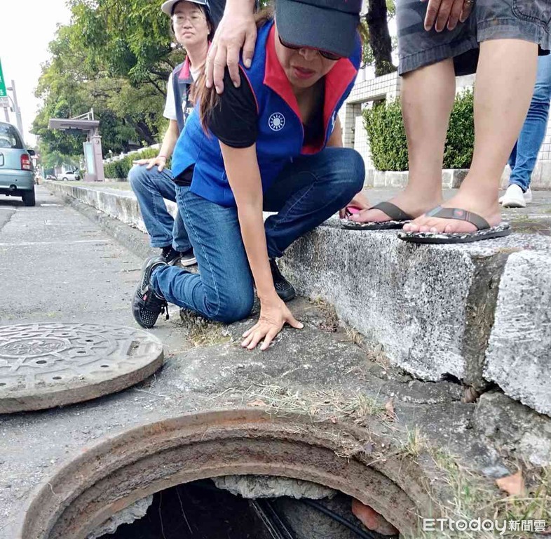 ▲為了更徹底了解崇明國中校門口因豪雨漫淹的問題,台南市議員王家貞等人,前往校門口外的地下箱涵進行現勘。(圖/記者林悅翻攝,下同)