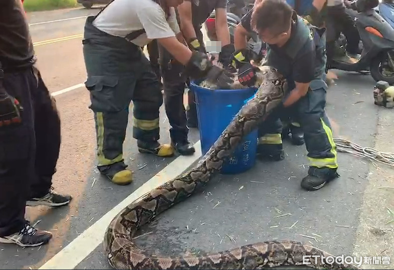 ▼多名專業人員合力把大蟒蛇裝到塑膠桶,但裝不下。(圖/記者吳奕靖翻攝)