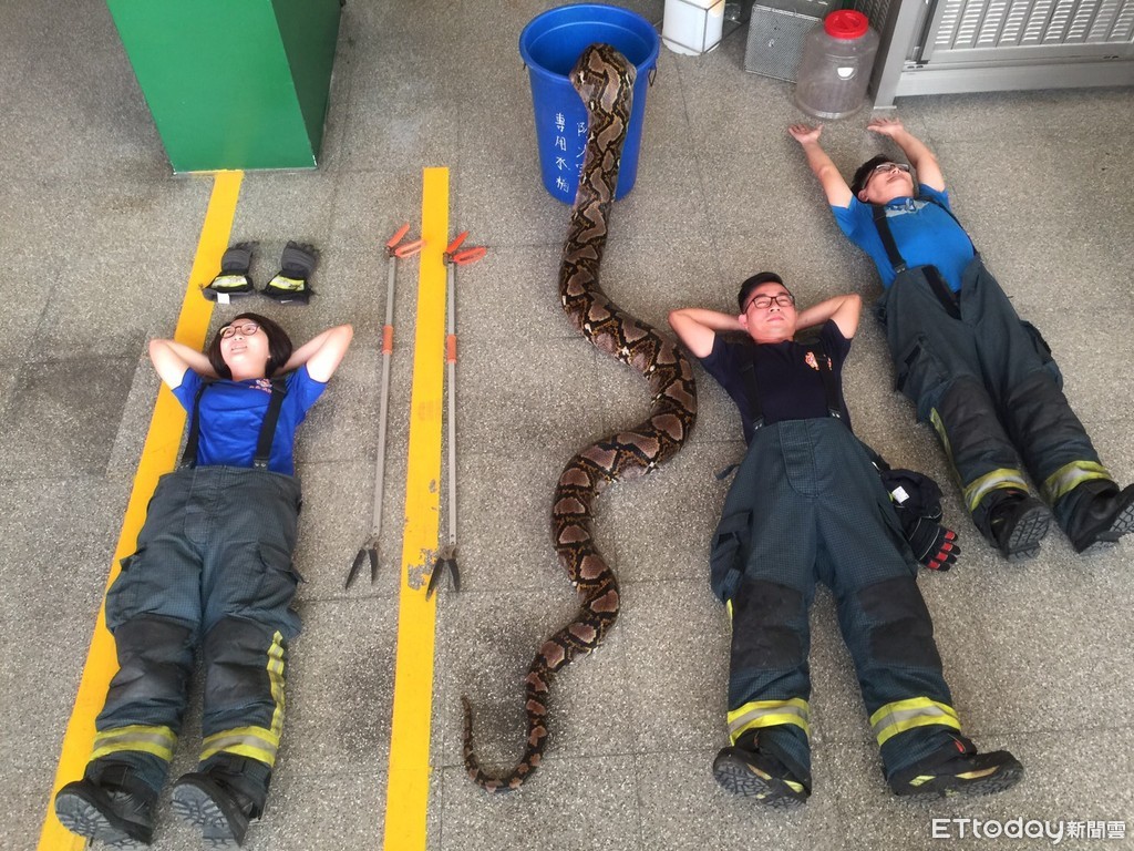臉書《爆笑公社》有網友貼出「最新開箱」,3名消防員躺在地上,最引人注意的是一條在藍色桶子內的大蛇,就算尾巴露在桶外,但身軀還是超過一名成人高度,網友留言嚇壞了,發現這隻蛇可說是「網紅」,被高雄市消防局鳥松消防分隊捕獲的「澄清湖大蛇」。