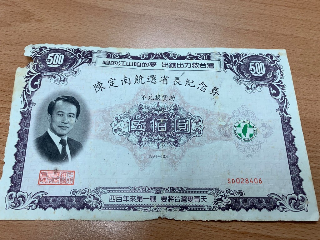 根據《自由時報》報導,陳定南在1994年參選台灣省長,民進黨當時經費短缺,因此推出「贊助紀念券」的募款方式,1種是不可兌換的無償紀念券,1種是可兌換的紀念券,面額均有500元、1000元,若候選人有300萬票,就可得9000萬元選舉補助款,可兌換的紀念券方便支持者未來將款項領回。