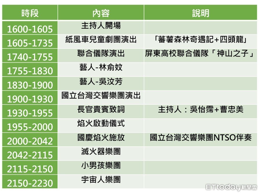 10月10日國慶焰火施放時間預計晚間8點開始,從下午4點起就有活動表演,縣府邀請到知名紙風車兒童劇團演出「蕃薯森林奇遇記」、屏東女孩林俞妏、藝人吳汶芳,及由內埔農工、恆春工商、屏東女中、屏東高中、民生家商等高中職學校組成66位聯合學生儀隊,進行靜默槍法、陸戰槍法等操演。