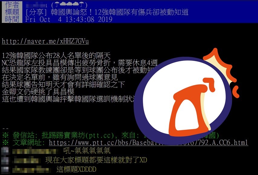 一名網友在PTT在Baseball版大玩文字遊戲,只見標題斗大寫著「韓國輿論怒!12強韓國隊有傷兵卻被動知道」,一秒讓高雄韓國瑜市長躺著也中槍。原來世界12強賽將在11月開打,原PO表示,韓國隊公布28人名單的隔天,NC恐龍隊左投具昌模傳出疲勞骨折,需要休息4週。