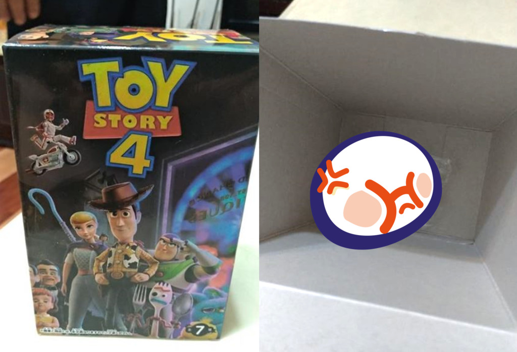 想不到一拆開,內部景象讓原PO超級傻眼,紙盒底部躺著一包用夾鏈袋裝起來的「叉奇」,雖然裡面確實有《玩具總動員4》的人物,但是尺寸非常小也很陽春,與原PO預想的模樣有一段落差,巴掌大的玩具竟然裝在超大紙盒內,讓他無奈地說,「這有沒有算欺騙消費者呢?」