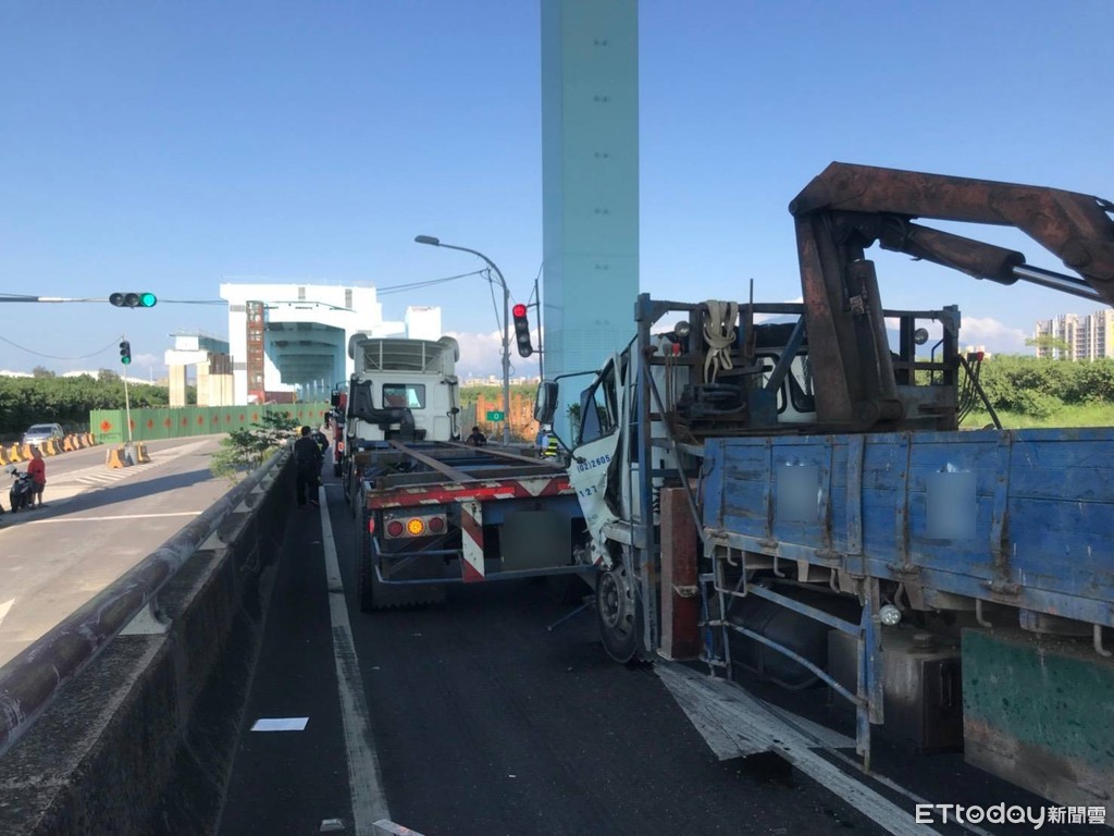 新北市八里64快速道路才剛發生一起嚴重死傷事故,車禍尚未排除,相距不到1公里處的61線北上下台北港出口的下坡處,又發生一起2輛大貨車車禍,其中一名駕駛受困車內,警消獲報後,正設法救援中,而詳細的車禍原因,還有待進一步調查釐清。