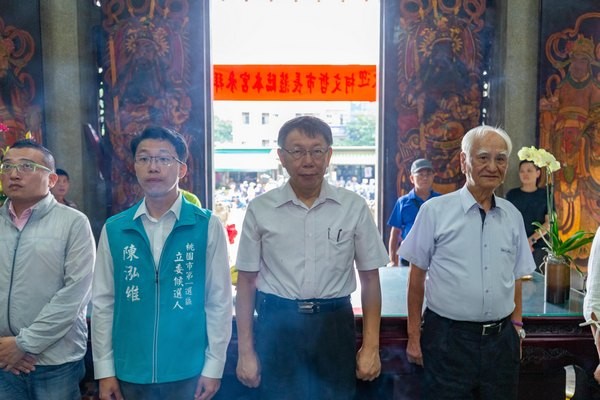 ▲柯文哲(右二)抵桃園市龜山區仁德宮祈福,接受訪問談民眾黨海選不分區立委情事。(圖/柯辦提供)