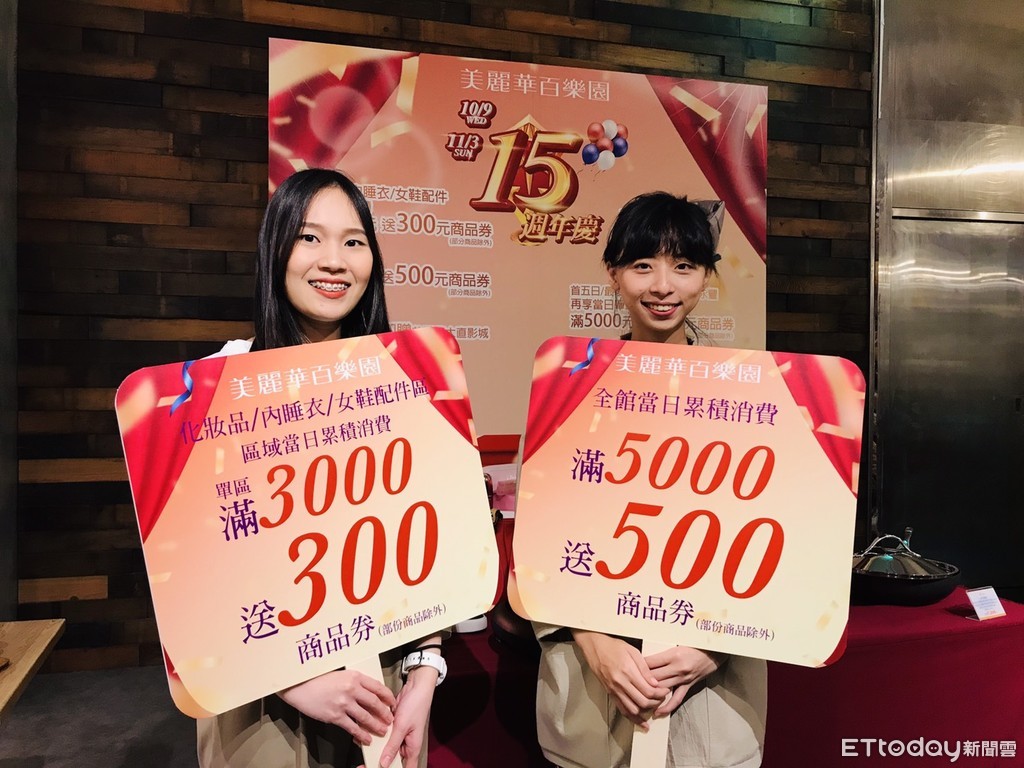 大直美麗華百樂園今(10/7)宣布周年慶優惠方案,從10/9至11/3期間,推全館消費滿5,000元送500元抵用券;化妝品消費滿3,000元送300元抵用券,今年也特別針對旗下聯名卡加碼,消費滿額加碼200元回饋、電影票與《與恐龍共舞》小巨蛋恐龍展門票,力吸家庭客。