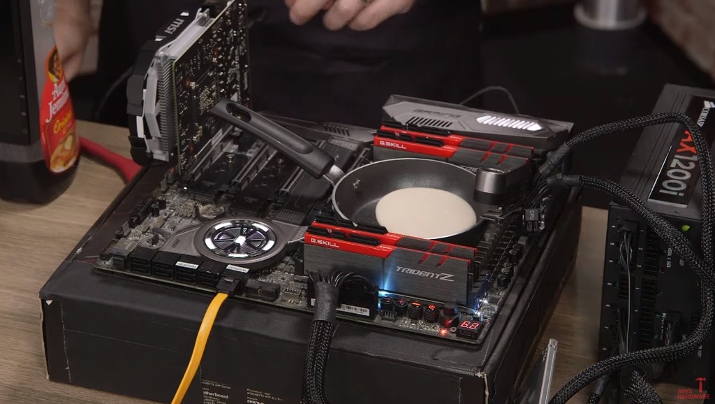在英特爾的實驗中,Tom's Hardware將CPU的溫度上限從100度增加至105度,並在平底鍋底部塗上散熱膏。Core i9-9980XE光是待機溫度就高達74度,運行後即輕鬆達到104度,雖然中間系統一度關閉,不過在他們安裝散熱風扇指向VRM(電壓調節模組)後,系統便再次開始運行。最終,Core i9-9980XE共花費18分鐘左右將鬆餅完全煎熟。