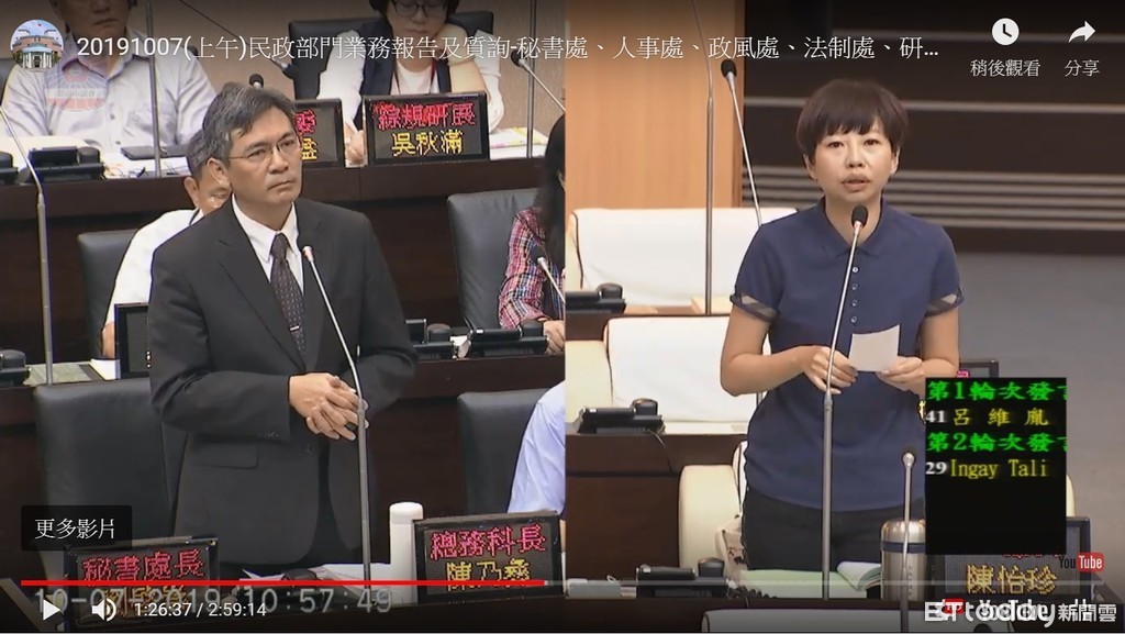 陳怡珍要求市府秘書處劉處長,應盡量減少委外派遣人力,增加市府工作機會,並擬定委外員額相關鼓勵辦法,提升委外派遣人員的福利,實質檢討派遣政策,以感謝第一線清潔人員的用心跟努力。