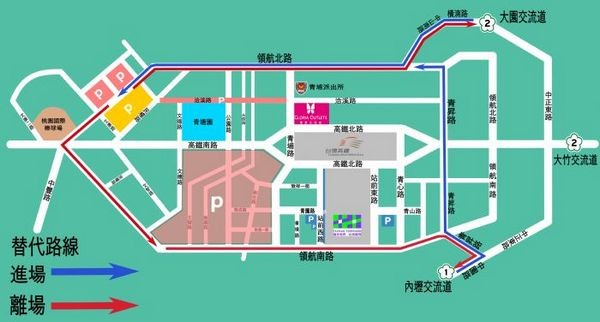 晚會活動停車場規劃於環溪一、二停車場(桃園國際棒球場、機場捷運A19站旁),自行開車民眾建議行駛領航北路前往停車場,可避開高鐵北路尖峰路段,且為方便民眾停放於環溪一、二停車場,桃園市政府也加開免費接駁車往返停車場及高鐵站,或桃園市區民眾可將車輛停放於風禾公園旁停車場,轉搭免費接駁車往返高鐵站。
