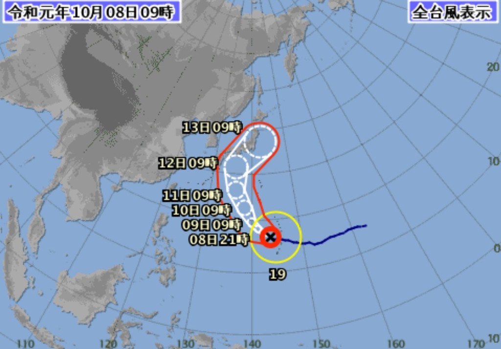 日本九州、四國及本州地區都會進入哈吉貝強颱的暴風圈,11日最接近沖繩的大東島地區,接著路徑朝北,12日至13日將一路橫掃九州、四國,並靠近本州,連東京都無法倖免。