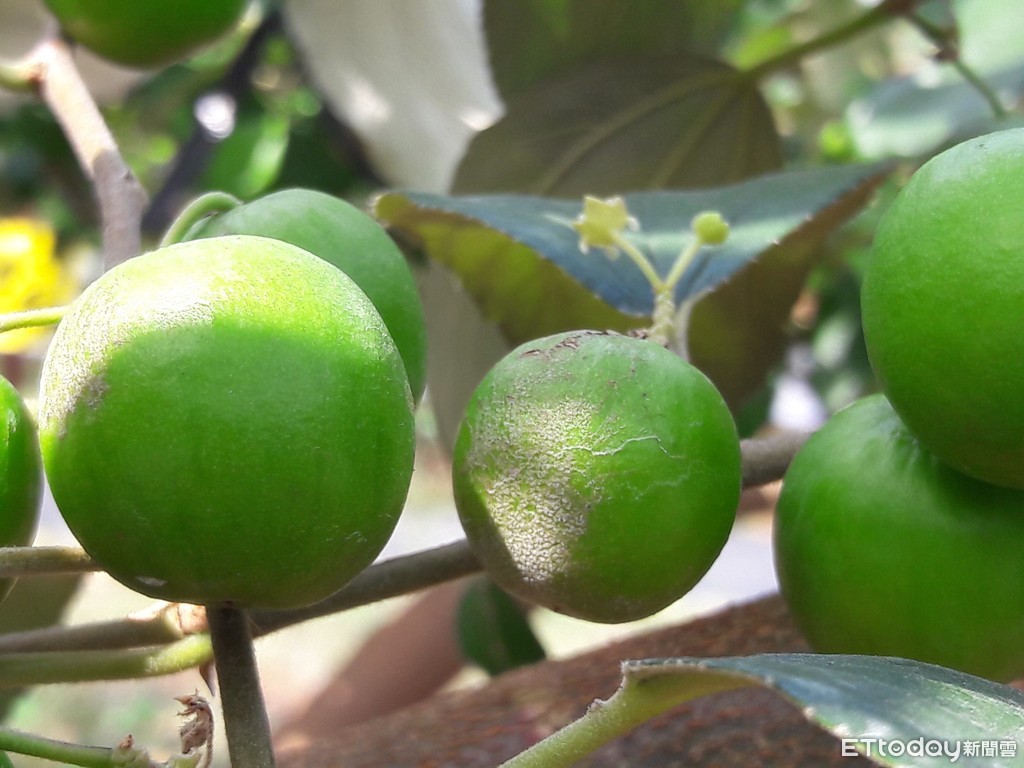 ▲最近天氣漸轉涼、日夜溫差大,且天候漸乾燥,是棗白粉病好發的季節;圖白粉病感染的果實,產生白色菌絲及分生孢子,猶如撒上一層麵粉般 。(圖/記者陳崑福翻攝)