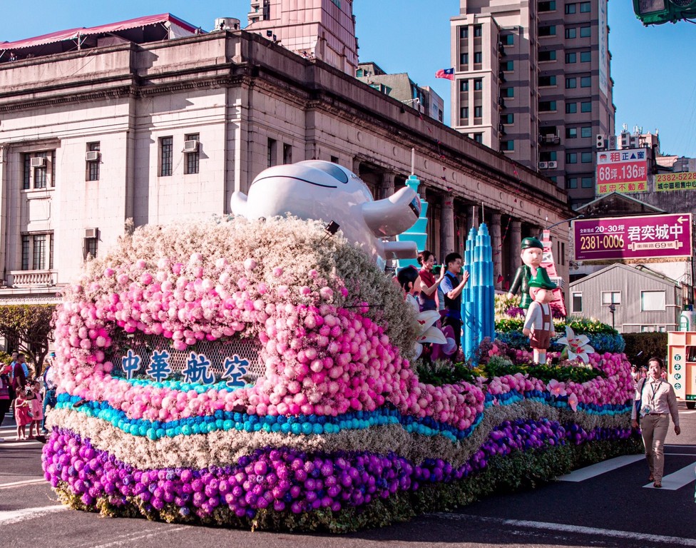 今年花車再邀得大葉大學造形藝術學系設計與製作,選用台灣在地花材,花語有象徵富貴的牡丹菊、優雅的天使花、嬌豔的仙丹花和浪漫的滿天星,配搭充滿生機的綠色植物長春藤與黃金葛,繽紛色調營造賞心悅目的視覺饗宴;隨車團體青春洋溢的表演與花車上4名空服員,同聲慶賀國慶及獻上華航60周年的祝福。