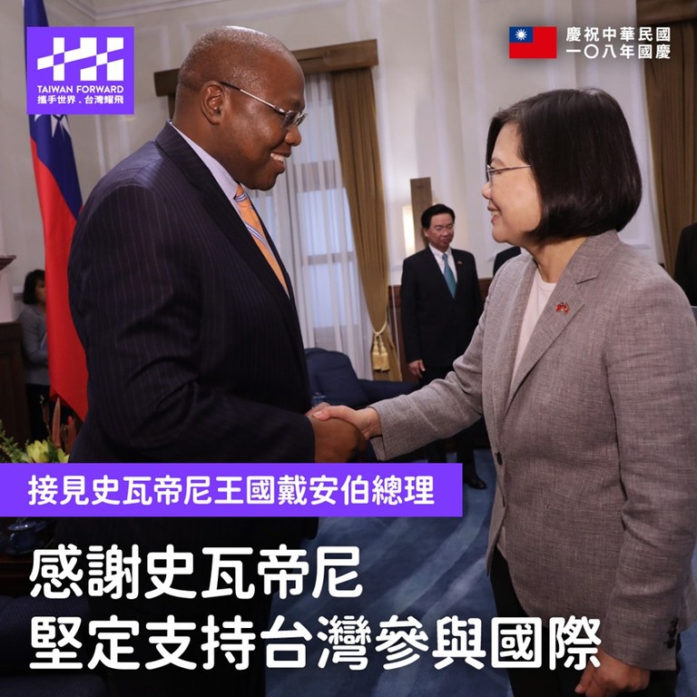 蔡英文上午先是接見戴安伯伉儷,這是對方第一次訪問台灣,展現出對雙邊關係的重視,彰顯兩國邦誼歷久彌新。蔡英文提到,在上個月的聯合國大會上,恩史瓦帝三世國王(King Mswati Ⅲ)呼籲聯合國,允許台灣尊嚴平等參與相關行動;戴安伯去年出席「聯合國氣候變化綱要公約」第24屆締約方大會(UNFCCC COP24)會議時,也為台灣發聲,肯定台灣對抗氣候變遷的努力,「這些支持行動都讓我們銘感於心。」