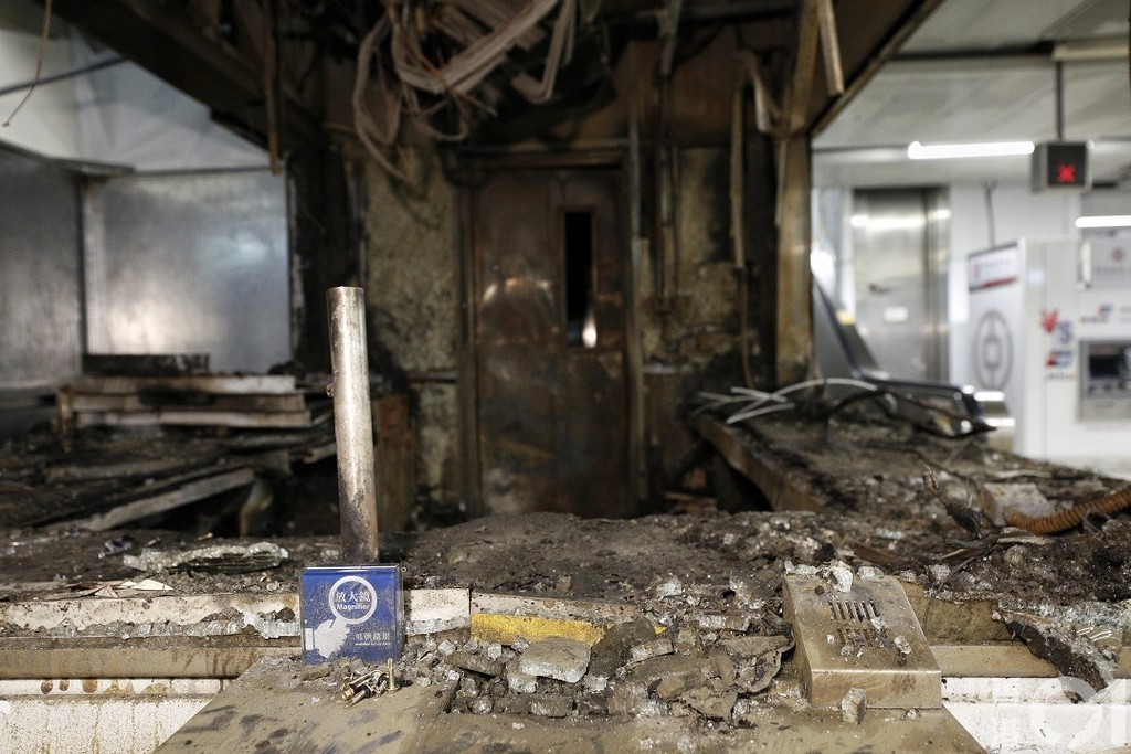 港鐵晚上安排傳媒到港鐵旺角站視察車站損壞情況,旺角站不少閘機損毀,地上有水漬,有竹枝雨傘殘骸;而觀塘站造焚毀的客務中心仍一片熏黑,現場仍有濃烈燒焦味道。