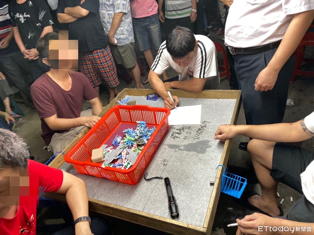 ▲台南市歸仁分局前往台南市龍崎區山區,破獲天九牌職業賭場,查獲主嫌陳姓男子及賭客共60名人。(圖/記者林悅翻攝,下同)