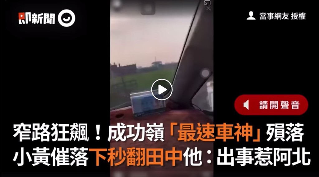 網友將影片轉載至臉書私密社團《爆廢公社》,只見影片中男子坐在副駕,一開始他還讚嘆運將的技術說「這個要我開我真的不敢開啊」,說完還聽到運將踩下油門加速的聲音。只是加速不過1秒,整台車就直接栽進田裡。