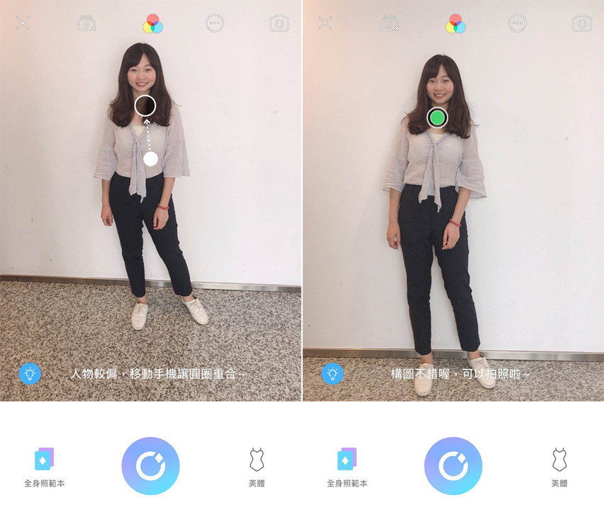 《美顏相機》的「全身模式」中內建3款實時修飾身型的套版,包含整體瘦身的「自然修飾」、主打長腿的「超模比例」、以及臀部修飾「S型曲線」,全身美型的同時也強化著重部位。「全身模式」不單只是調整身型及腿長,還加入首創「重合黃金點」構圖提示,只要構圖準確就會出現綠色點點標示,簡單引導用戶拍出完美比例。