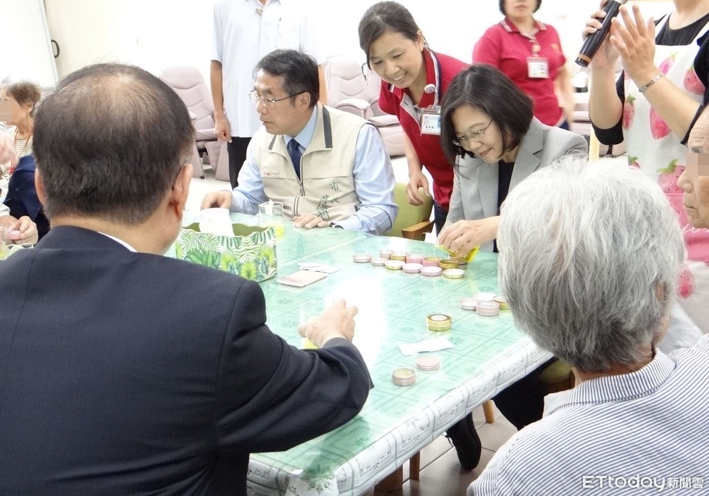 ▲總統蔡英文在台南市長黃偉哲陪同下,訪視台南市永康區「奇美復華日照中心」,並與長輩及家屬一起參與該中心「福祿壽學堂」照顧者支持團體活動。(圖/記者林悅翻攝,下同)
