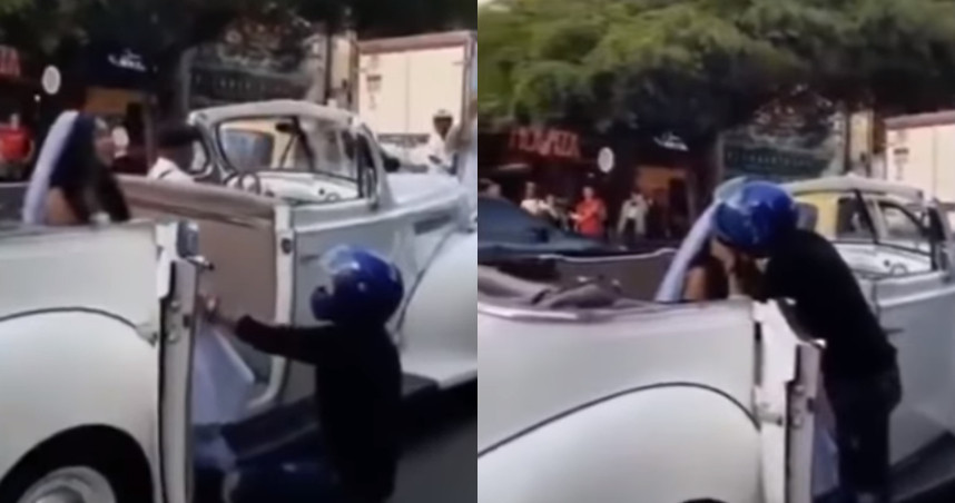 根據外媒報導,這名戴著藍色安全帽的男子,不斷苦苦哀求前女友不要結婚,更不惜在眾目睽睽的情況下跪地,從影片中還可看到,新娘當下的情緒也十分激動,還一度用手摀住雙臉,旁邊還傳來圍觀民眾的加油聲:「不要結婚,親她!親她!」