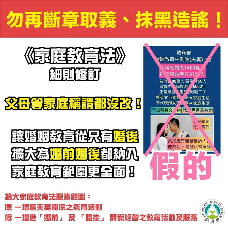 教育部強調,此目的是在擴大家庭教育服務範圍,相關條文內 「父母」等家庭稱謂都還在,也不會改變,請勿再斷章取義、抹黑造謠。同時再次感謝各界對於家庭教育的關心與重視,爲取得最大修法共識,目前「家庭教育法施行細則修正草案」預告也歡迎各界持續提供修正建議,所提相關意見均將納入後續草案研參。