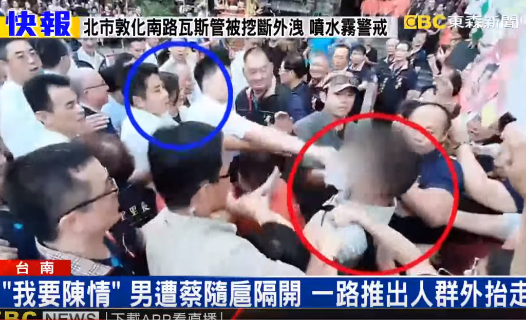 國安人員見狀,立刻將簡男手上的紙搶過,並與廟方人員直接將簡男推出人群,隨後拉起對方的四肢立刻抬走。期間,簡男一度因推擠摔倒,當國安人員將他抬起時,一名婦人正巧被壓在底部,因此事後憤而對簡男提告,相關單位事後也安撫婦人,希望她不要提告。