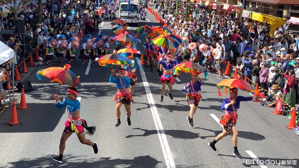 ▲▼踩街大遊行時,台東高商表演活力四射,日方感受到來自台灣代表的魅力演出,現場觀眾更是頻頻掌聲叫好。