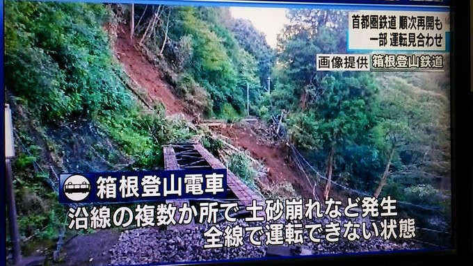 箱根町同樣也受到影響,不只登山鐵道沿線都發生崩塌情況,導致小田原至箱根湯本、箱根湯本至強羅的登山電車,以及強羅至早雲山的登山纜車通通停運,幾乎等於全線無法運行。