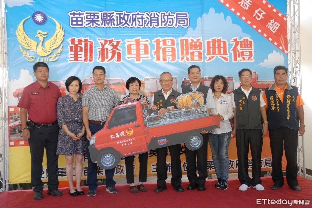 ▲苗栗縣造橋鄉廖姓母子,捐贈百萬元添購消防設備給造橋分隊,縣長徐耀昌親自到場主持捐贈儀式。(圖/記者黃孟珍翻攝)
