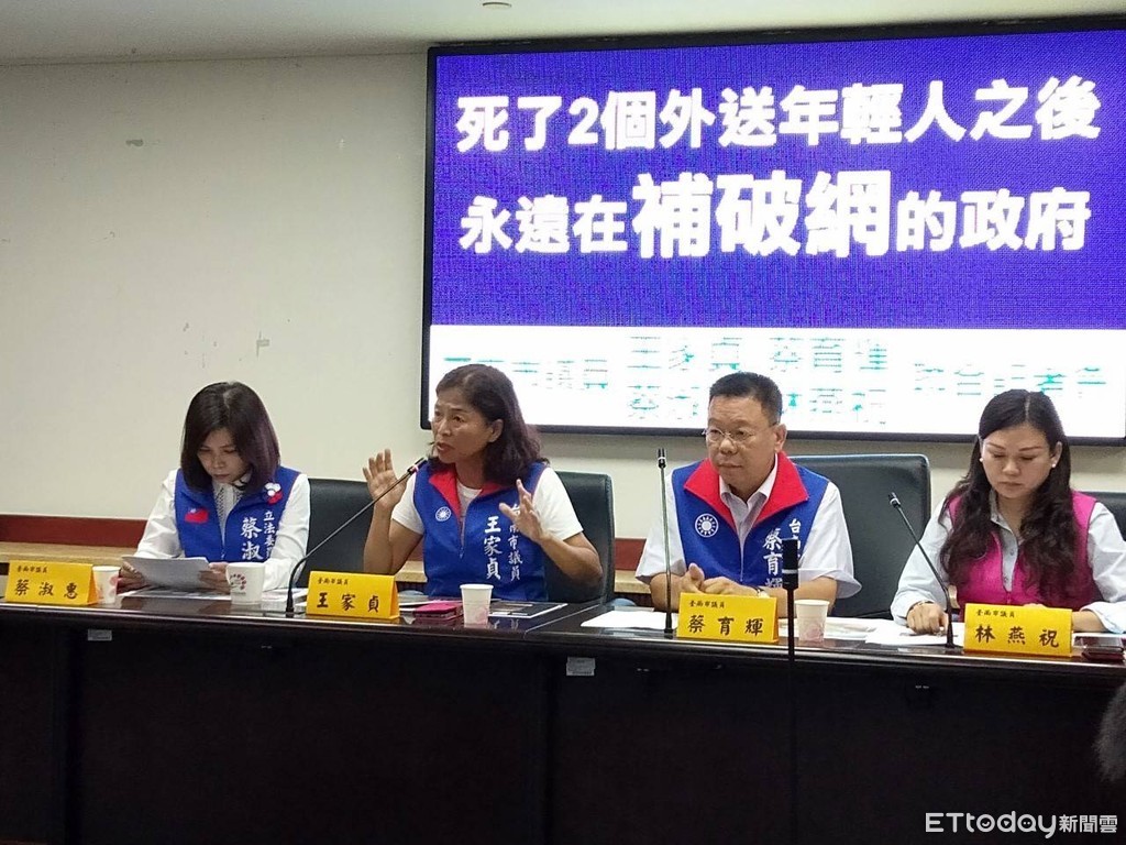 痛心兩名年輕外送員殞逝,台南市議員王家貞、立委參選人蔡育輝、林燕祝、蔡淑惠聯合召開記者會痛批,外送員為錢拼生命,卻遭不平等的承攬契約壓榨,要求市府依職責積極稽查新興外送行業員工,到底有無加入工會勞保,勞工局等單位坦承還沒行動,但11月會開論壇。