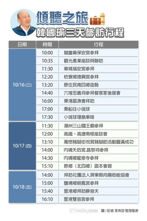 ▲韓國瑜三天參訪行程。(圖/記者李帛窈 整理製表,點圖可放大)