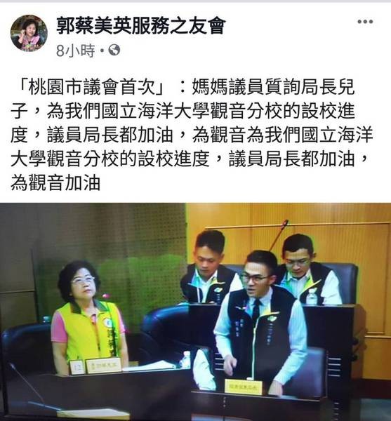 郭蔡美英是在9月間遞補市議員,上任不久市議會即召開定期會,因兒子郭裕信擔任市府經濟發展局長,郭蔡美英今天於經發局工作報告後,質詢說,海洋大學在觀音設立分校,去年揭牌至今已逾一年,「請郭局長說明目前進度」。