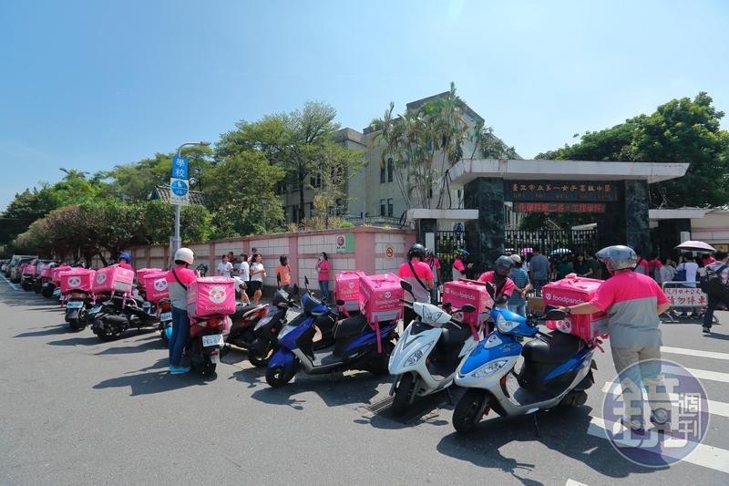 「以前每逢中午時刻,學校大門口都是爸爸媽媽或阿公阿嬤來送便當,現在滿滿都是foodpanda粉紅色大軍,尤其今年更明顯。」家住北市北一女附近20多年的陳先生說。而且,不只是學校大門口,現在中午、下午茶或是晚餐時間,信義區、敦化南路、松江路等商辦商圈的公司大門,也處處可見外送員俐落送餐的身影。