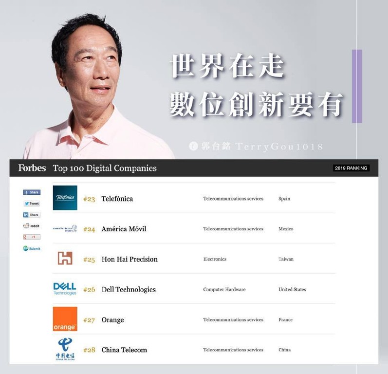 《富比士》(Forbes)雜誌公布2019年全球百大數位企業榜,台灣從原本6家入榜跌到只剩2家。鴻海創辦人郭台銘表示,「AI 智慧島」的發展已經刻不容緩,台灣必須追求數位的創新紅利,才能跟上世界科技及數位發展的浪潮。