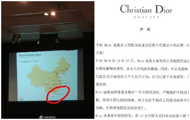 Dior之所以於凌晨突然表態政治立場,主要是因為Dior在中國一所大學中進行宣傳演說,而準備的簡報影片中,所標示的中國領土「少了台灣」引發台下同學激烈反應。針對台下同學發問「為何地圖上沒有台灣?卻反而有面積更小的海南島?」負責回應的人則表示,中國大陸為中國,中國大陸加上香港、台灣則是「Great China」,這樣的回應立刻引發學生不滿,進而在網路上討論。