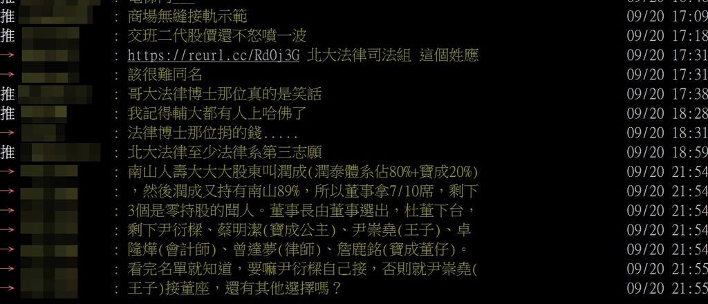 另外,也有網友指出,南山人壽大大大股東叫潤成(潤泰體系佔80%+寶成20%),然後潤成又持有南山89%,所以董事會拿7/10席,剩下3個是零持股的聞人,董事長由董事選出,杜董下台,剩下尹衍樑、蔡明潔(寶成公主)、尹崇堯(王子)、卓隆燁(會計師)、曾達夢(律師)、詹陸銘(寶成董仔)。看完名單就知道,要嘛尹衍樑自己接,否則就是尹崇堯(王子)接董座,還有其他選擇嗎?