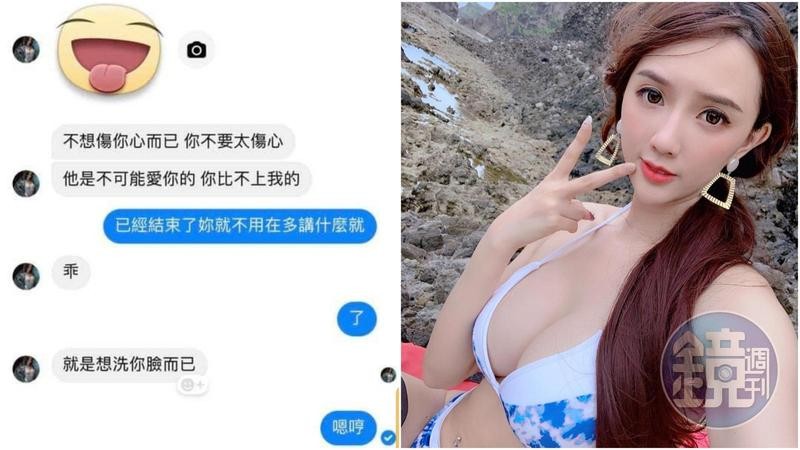只見私訊中,翁子涵嗆她「不想傷妳心而已,妳不要太傷心」、「他是不可能愛妳的」、「妳比不上我的」等等;W小姐則回,「已經結束了妳就不用在多講什麼」;翁子涵則接話「乖」、「就是想洗妳臉而已」,後來W小姐回她「嗯哼」作終。