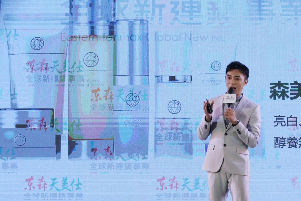 ▲美妝保養達人Sam於「2019東森全球新連鎖事業年會」中介紹森美妍新品特色,大推「無論是質地、香氣、使用後的持續保養效果都很棒」。