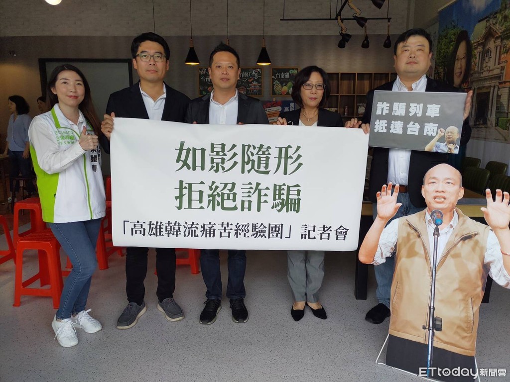 ▲韓國瑜到台南造勢,高雄市議員們組成「高雄韓流痛苦經驗團」,到台南小英競選總部召開記者會,向台南市民呼籲「反詐騙」。(圖/記者林悅翻攝,下同)