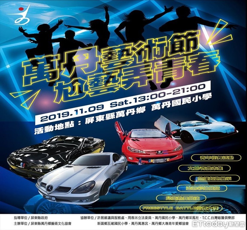 這項名為「萬丹藝術節 尬藝弄青春」活動,將邀請來自屏東各個 國小 到 大專院校的《舞蹈社團》前來表演;除街舞比賽,還有《塗鴉彩繪》展覽、《文創青農市集》以及《敞篷超跑》展示。