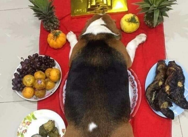 原PO在臉書社團「爆笑公社」貼出照片,右邊擺著一盤煎魚,左邊還有橘子、葡萄及甜粽,前方擺2顆南瓜2顆鳳梨,還有一些假金塊,重點就是趴在中間這一尊,吃得肥肥胖胖的米格魯,四肢張開趴在盤子上的模樣,還真有點像用來大拜拜的豬公。