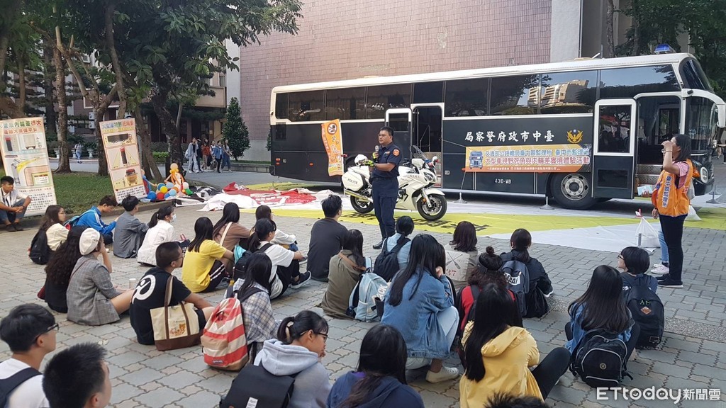 ▲台中市政府交通局、交通警察大隊及台中監理所,組成團隊前往台中科技大學宣導正確道安觀念。(圖/警方提供)