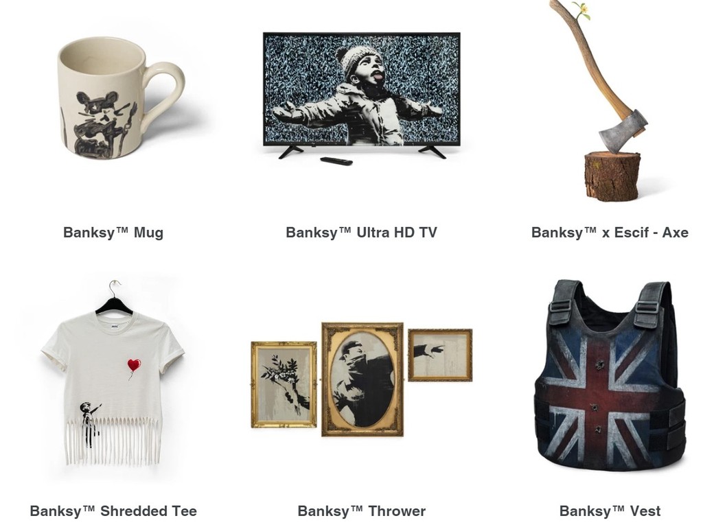 班克西網路商店販賣的商品充滿惡趣味,並以作品諷刺時事,維持班克西的一貫手法。像是有班克西簽名的廢噴漆罐、《氣球女孩》的流蘇T恤等。