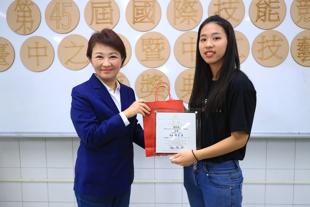 堪稱「技職界奧運」的國際技能競賽,台灣與60多個國家競爭中,團隊成績名列第4,其中畢業於台中高工的楊婷喻在汽車噴漆項目首度摘金,榮獲「國家最佳選手獎」,市長盧秀燕21日前往台中高工表揚,讚許選手們是「青年典範」。