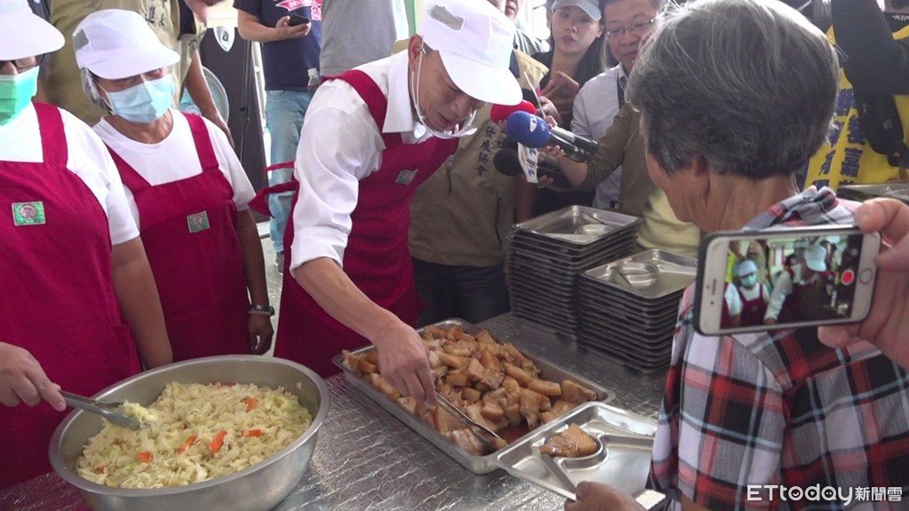 國民黨總統參選人韓國瑜,全力準備2020年總統大選,請假展開傾聽之旅,緊接著來到嘉義,21日一早參拜水上璿宿上天宮,接著前往崩山社區活動中心老人食堂與長者共餐,韓國瑜化身打菜郎,才剛幫6位長輩夾完肉,就立刻被打斷。