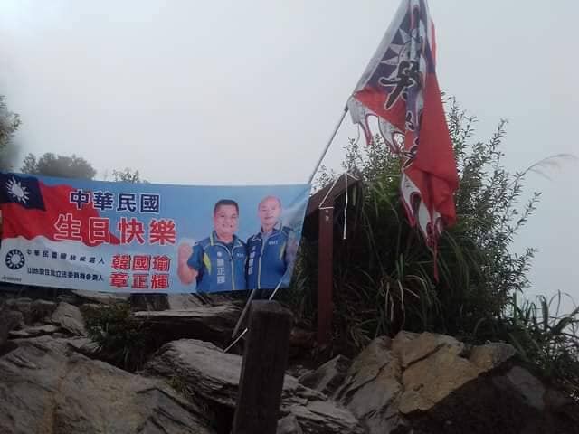 ▲韓家軍爬上北大武山插國旗和競選布條,議員竟稱「傳遞排灣族榮耀」,被學者抨擊。(圖/翻攝臉書)